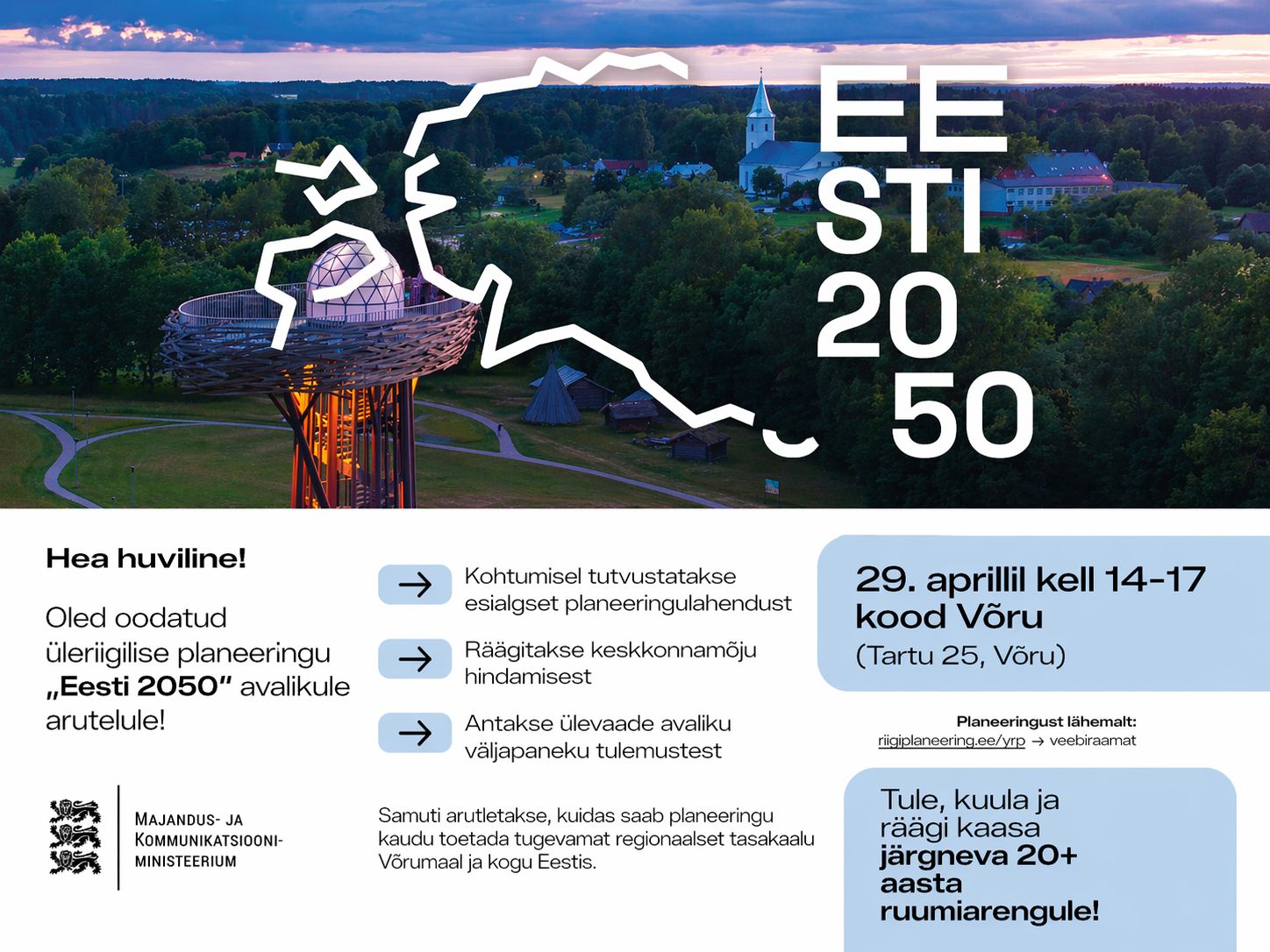 Üleriigiline planeering “Eesti 2050” Kõik huvilised on oodatud üleriigilise planeeringu „Eesti 2050“ avalikule arutelule 29. aprillil kell 14-17 kood/Võru kooli (Tartu 25, Võru). Kohtumisel tutvustatakse esialgset planeeringulahendust, räägitakse keskkonnamõju hindamisest ja antakse ülevaade avaliku väljapaneku…
