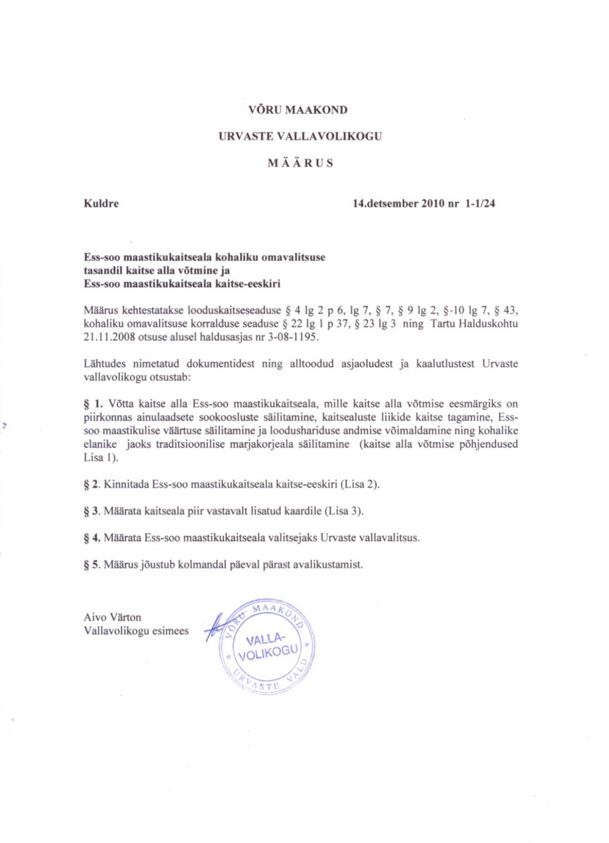 Ess-soo maastikukaitseala kohaliku omavalitsuse tasandil kaitse alla võtmise ja Ess-soo maastikukaitseala kaitse-eeskirja kehtestamise põhjendused:
