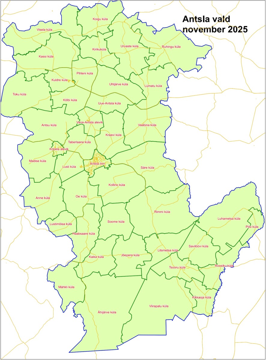 Antsla vallas on 39 küla, 2 alevikku (Kobela ja Vana-Antsla) ning üks vallasisene linn – Antsla.